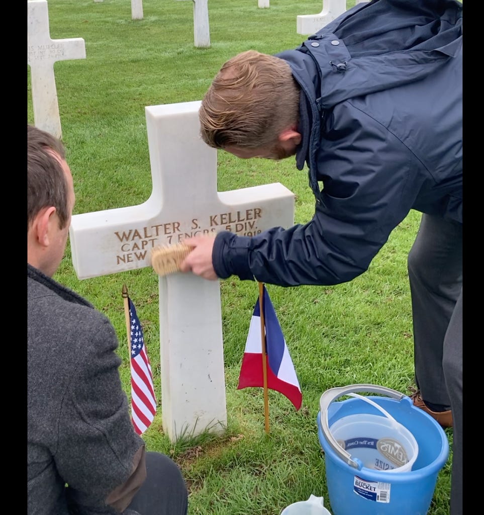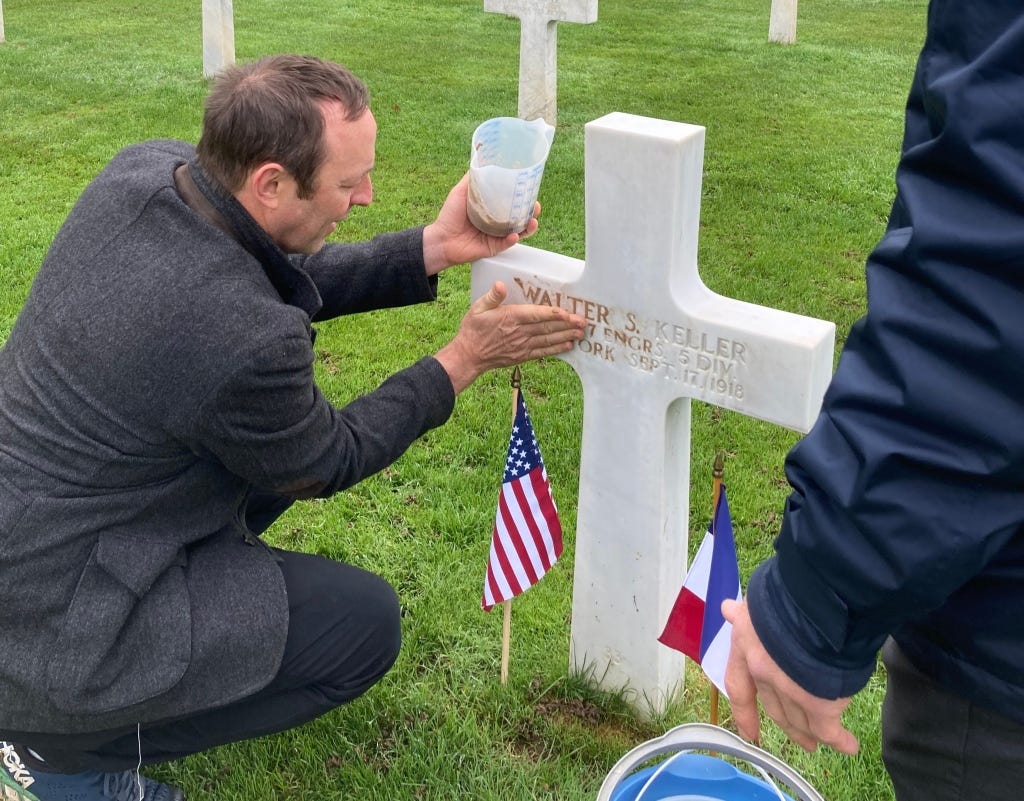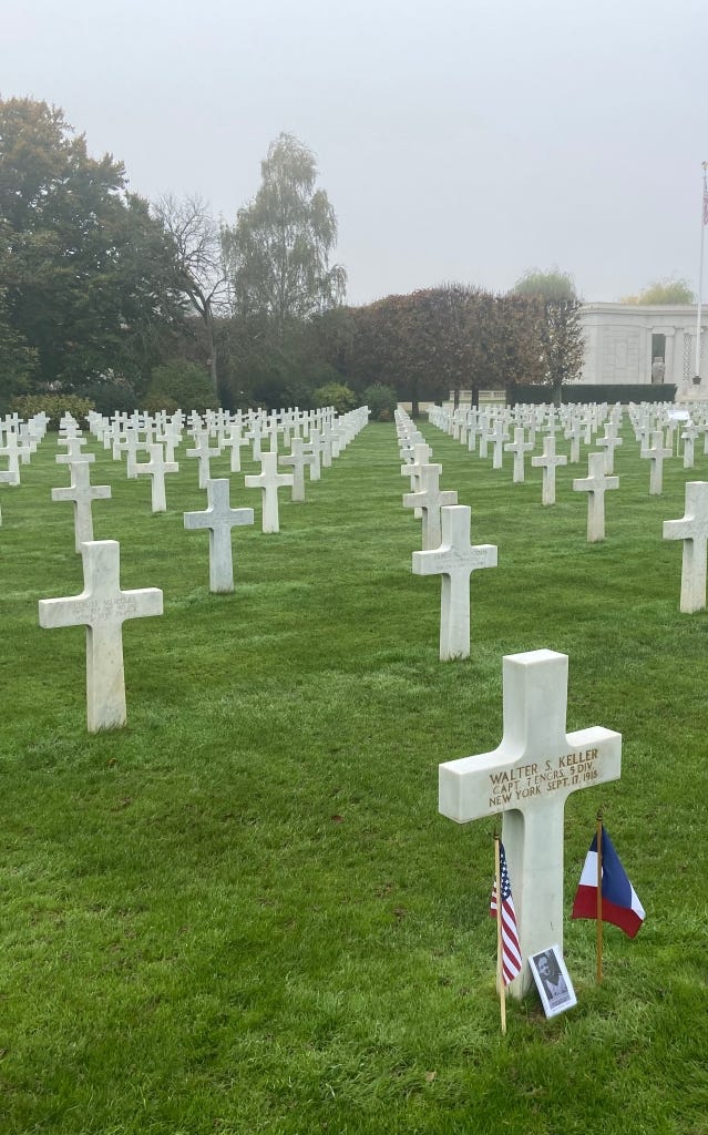 My interest in Walter had been growing since I moved to Europe in 2019 and began periodically driving past battlefield cemeteries full of American soldiers from the world wars. It occurred to me for the first time that I might be able to visit Walter Keller’s grave, and perhaps I should, especially when I realized he had fallen just a few hours’ drive from where I live in Brussels: at the battle of St. Mihiel. I discovered this, though it may reinforce my status as an aging gen-X cliché, through Ancestry.com, a hobbyist family-tree building app, to which my wife had given me a subscription as a 50th birthday present.