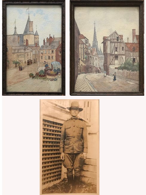 In a series of different homes where she lived, my mother Lucy Mallan displayed a trio of postcard-sized framed pictures she had inherited from her grandmother. Two were watercolors (2nd) of idyllic Alsatian village scenes dated 1915, and the third was a 1917 photo of the painter, in his American military uniform, not long before he shipped out to France to fight in WWI. This was the only photo of anyone in uniform among my mom’s family, and always stood out, especially in juxtaposition with the lovely little paintings she always hung it with.