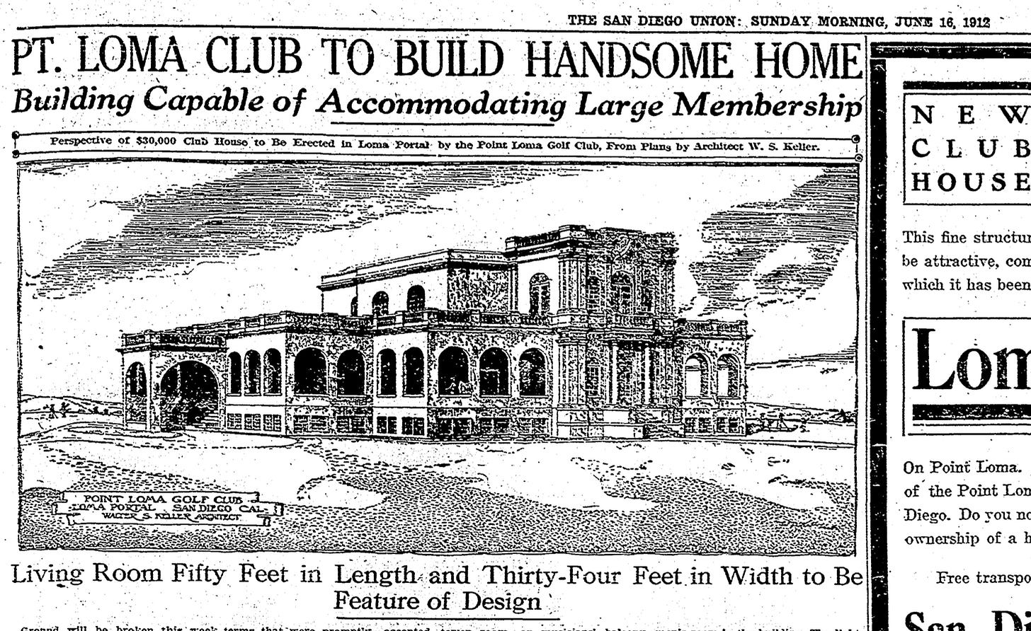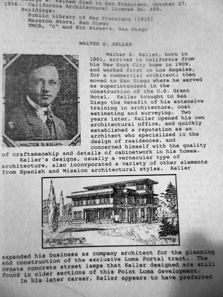The years before the war were a gilded age of development in San Diego. It was a new and modern city, with many prosperous families building mansions, country clubs, and multi-use high rises, many in cool new California styles with shades of Spanish colonial architecture and aesthetic links to the burgeoning Arts and Crafts movement. These beautiful, historic buildings were all catalogued –with Walter’s many contributions fully credited and documented, first thanks to USD’s 1984 undergraduate project, and then in a second study that Susan shared with me next, written four years later by a scholar named Richard Carrico: a full thesis entirely on the subject of Walter Keller and his place as one of San Diego’s ‘shadow architects.’
