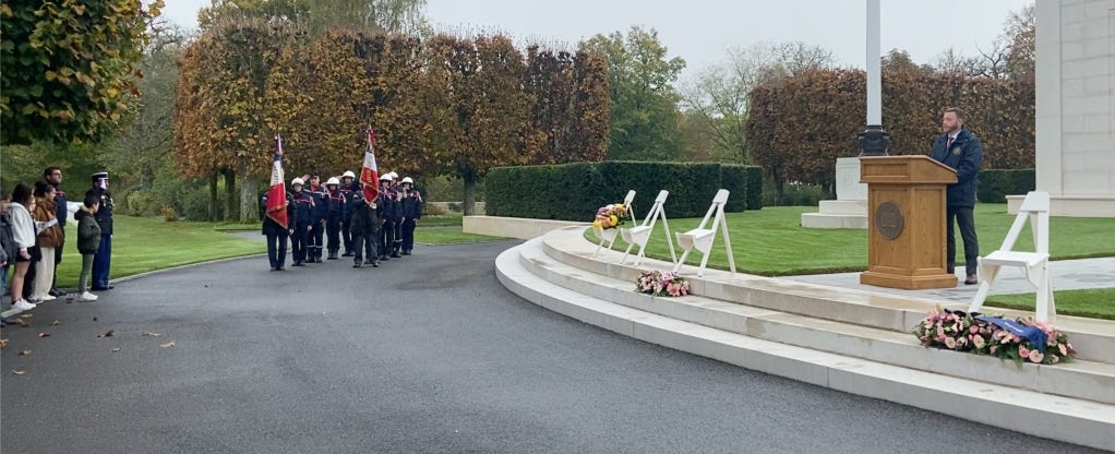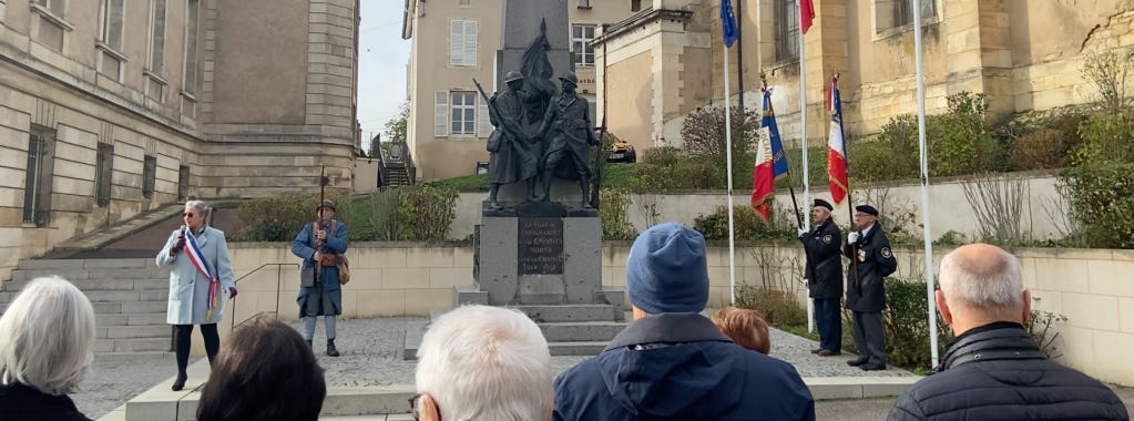 Yes, by then it was clear that the crowd–mostly French people, ages 8-80--had gathered for special events connected to the date: 11 November, which we call Veterans’ day and have tied to all veterans, but which the Europeans still call Armistice Day, on which they specifically reflect on the sacrifices and lessons of World War One. As school teachers, of course, we see it first-and-foremost as a 3-day weekend that our bosses only sometimes choose to give us off, when the 11th falls close enough to a weekend. More than for any other reason, we were at the cemetery that day because the 11th was a Friday.