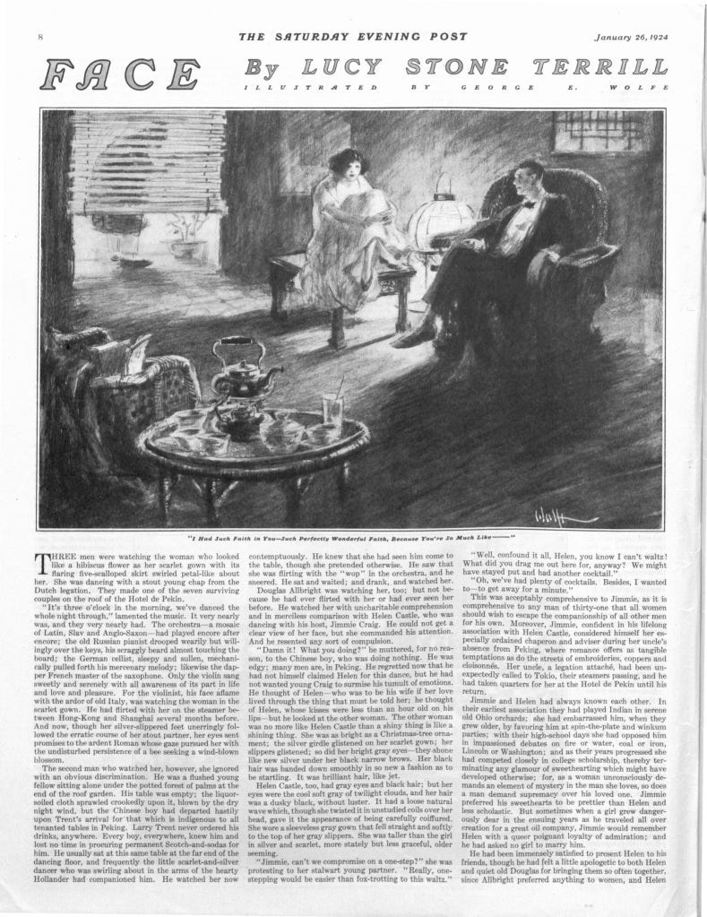 I would learn so much more about Lucy Stone Terrill but the initial web search revealed one short story she had written in 1924 for the Saturday Evening Post, entitled Face, about the widow of an American WW1 veteran who encounters one of her late husband’s comrades when both are in Shanghai. I wondered to what extent this was autobiographical, kept googling, and found a reference to Lucy and this story in a 2012 study of war widows that told the true story of her traveling to France in the aftermath of Walter’s death to work with his company as a YWCA volunteer.