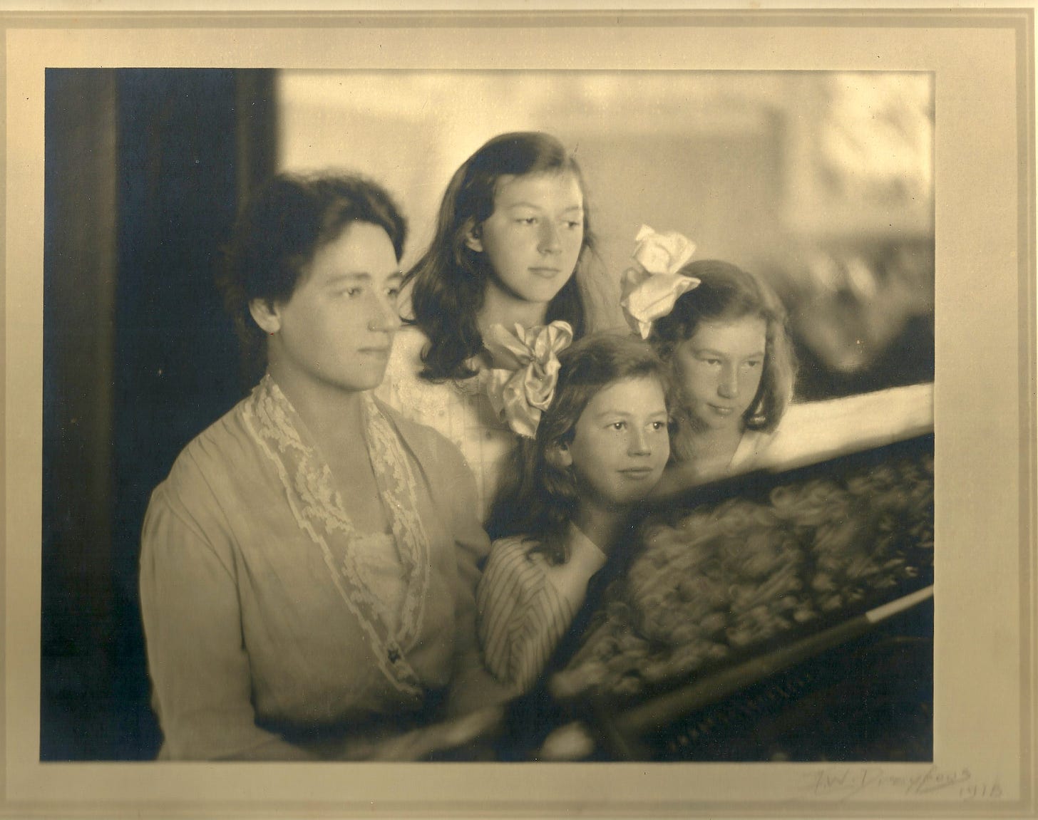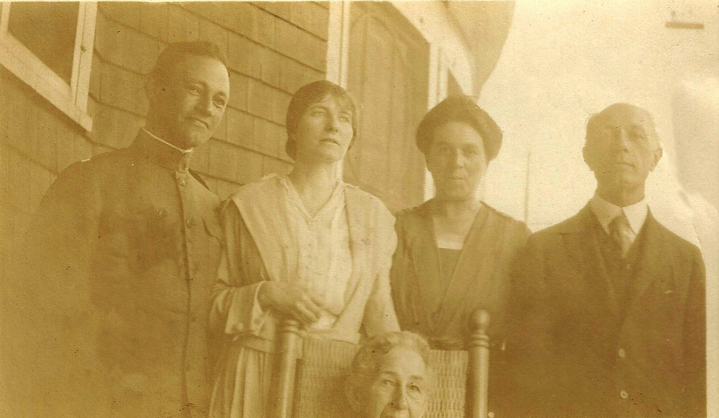This last realization sent me back to the photo and others from the summer of 1917 when he enlisted. I realized I was looking at an older man than the teenage doughboy I’d imagined crouching (and painting) in a trench. He was handsome, with intelligent eyes and a warm expression. His siblings were all grown up as well–here’s a photo of them with their mother at what was likely a farewell gathering–given that Walter was already in uniform–including his sister, my great-grandmother Florence, who was raising her three little girls with my great grandfather Laurence Tanzer.