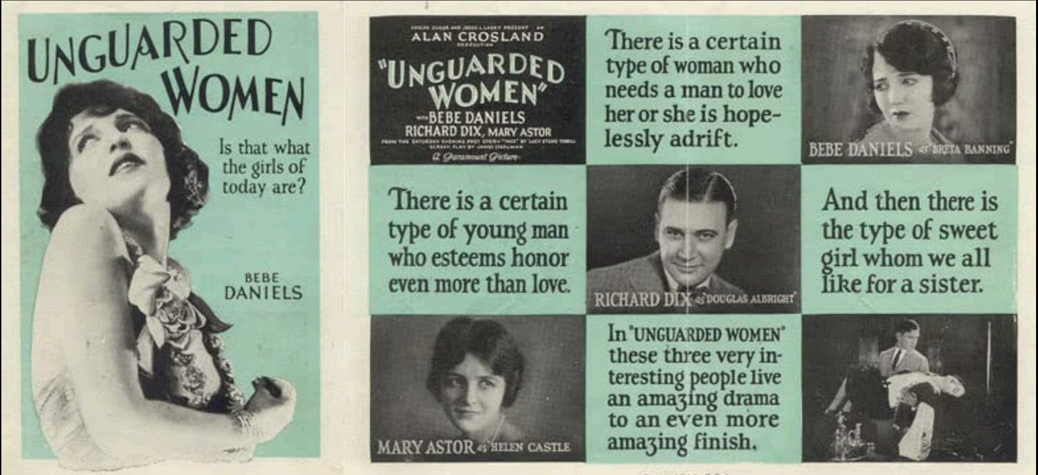 She then returned to San Diego, where she restarted her life as a teacher and continued to write and publish. But before long she left for an intrepid and extensive journey around Asia. Her postwar European and Asian travels clearly colored her 1924 short story Face. This features the characters of a young war widow and a veteran who meets her in Peking, both haunted by their losses in the French trenches. This was one of her biggest successes, and was adapted into a film called ‘Unguarded Women,’ a film sadly now lost except some very cool posters.