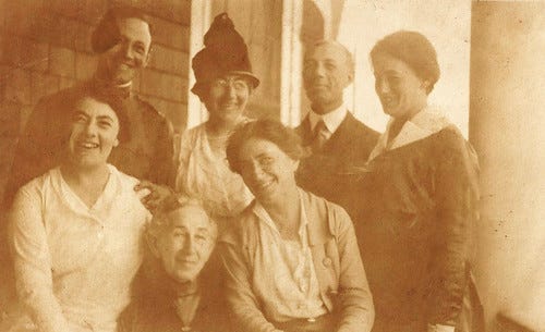 Hard to know why Walter had headed west, and moved so much farther away than the other siblings, but Florence’s description seems very warm, and he appears to be enjoying his siblings in the group shots we have of him before going off to training. His mother Clara seems less happy in those photos from just before he shipped out (nor does Lucy—both are surely feeling the risks facing him). Walter seems by far the most jovial; given his rough riding past, he may well be looking forward to breaking away and taking on the war as yet another adventure.