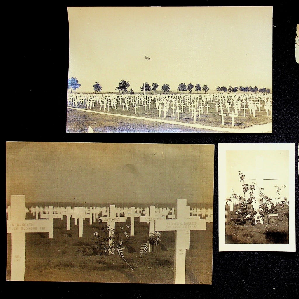 I wondered if Florence had been struck by the use of a cross to mark the grave of her brother, given that they were raised as secular Jews, and to my knowledge he never converted to Christianity, though he was married (by a reverend) to what seems to have been a secular Christian woman, whom he’d listed as his next of kin. There have been recent efforts to change the crosses to Stars of David for several WW2 vets, and the Cemetery commission willingly does it upon request. I mentioned to the Superintendent that Walter was Jewish and he very earnestly said I could come fill in a form and they’d change it right away. But I couldn’t be sure if that’s what Walter would have wanted–he was raised quite irreligiously as far as I can tell and his widow would have known best what his wishes would be–so I thanked the Superintendent but said we’d stick with the cross for now.